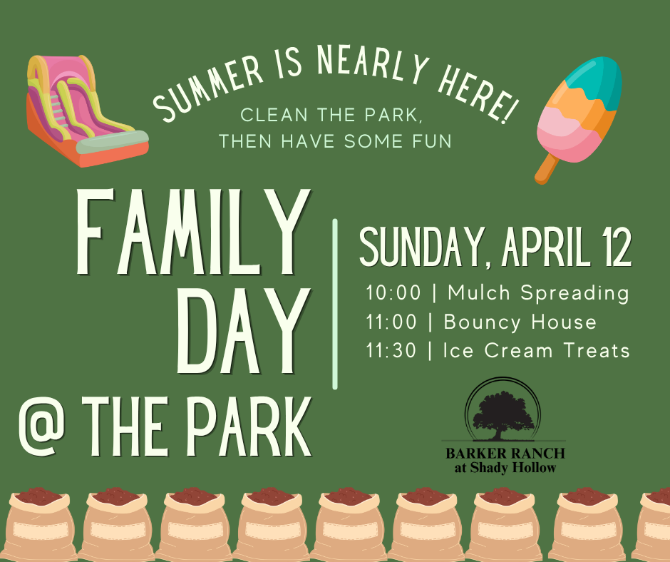 After the work is done, stick around for some well-earned fun. A bounce house will be there for the kids to enjoy from 11:00 AM to 2:00 PM and Ice cream from Good Times Austin (www.goodtimesaustin.com) will be available from 11:30 AM to 1:30 PM. This will be a great opportunity to meet your neighbors, enjoy time together at the park, and make it a fun day for the whole community.
